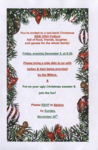 Friday, December 5, at 5:30 p.m. is the all-church Christmas party hosted by Pastor Tim, & Ashton Miller. They are providing the turkey and ham and are asking everyone to please bring a side-dish. An insert with more information will be out next Sunday!